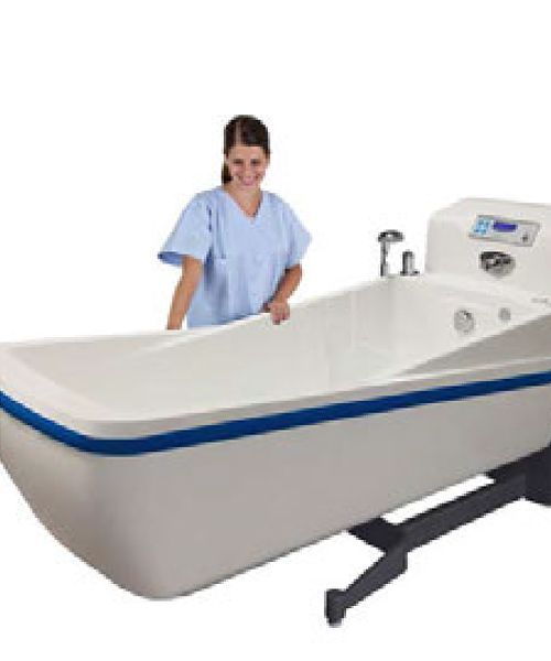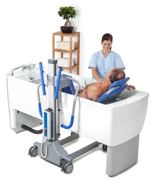 Compatible with most chairs and bath stretchers, elegant design, ergonomic shape, low access point on each side promoting proximity between the caregiver and resident, impact protection around the shell, footrest to shorten the tub and to reduce risks of patient slipping, high quality thermostatic mixer, electronic anti-scalding protection, simple and user friendly electronic keypad, and several other options available.