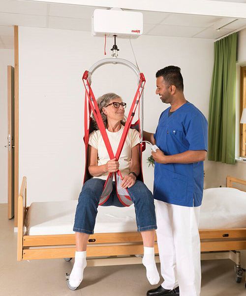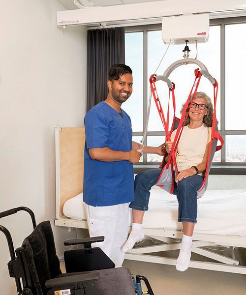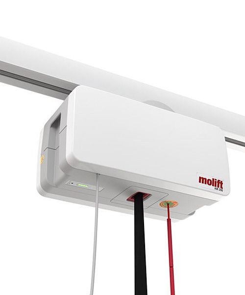 Molift Air 200 offers flexible solutions such as In-Rail Charging (IRC), Propulsion, remote control and possibilities for room-to-room transfer. Add to this the safety features, the large hoisting interval and the multiple range of sling bars. This hoist is the complete solution in all health care segments.