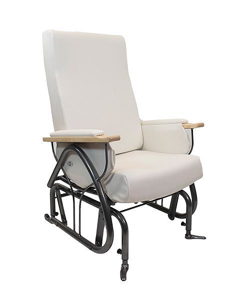 Various studies have shown that rocking reduces anxiety and provides multiple health benefits. This action has the effect of decreasing agitation, medication and the call to caregivers. The Metal Thera-Glide® self-locking glider has been developed to allow all persons at risk of falling to benefit from the therapeutic effects of rocking while avoiding the dangers associated with an unstable chair. The Metal Thera-Glide® provides benefits, adaptability and a friendly look that meets the requirements of all health communities.
