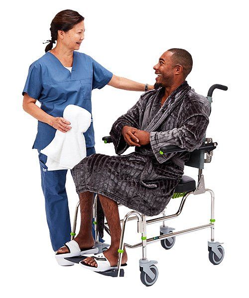 The RAZ-AP mobile shower commode chair comes standard with 4” of height adjustment, an adjustable-tension fabric backrest, 5” dual-locking casters, flip-up padded armrests, and a commode pan. The easy-to-clean, polished stainless steel frame is designed for easy side and front access by the user or attendant.