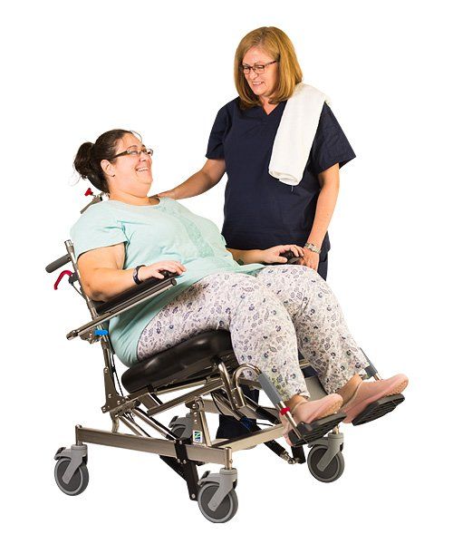 - enables attendant to use additional strength from legs to tilt larger/heavier users
